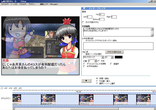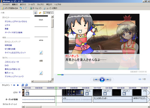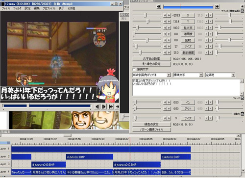 ロード中の画面とか、ブラックアウトが長い時とかガツガツ分割してカットしてます。動画部分の分割に自動で合わせて音声ファイルが置けるので、この段階でBGMを載せています。Aviutlみたいにレイヤー機能があったら便利なんですが……